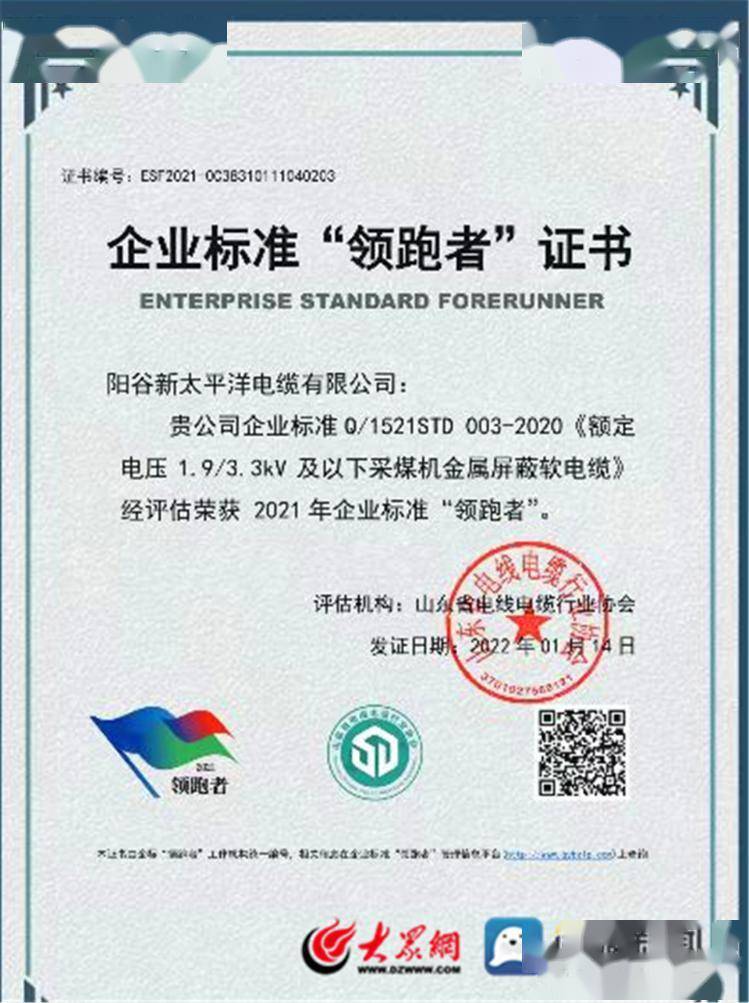 2021年度阳谷县山东日辉电缆集团有限公司、山东AG尊时凯龙人生就集团有限公司、等5家企业的8项企业标准荣获企业标准“领跑者”证书,获批数量居全市第一位。